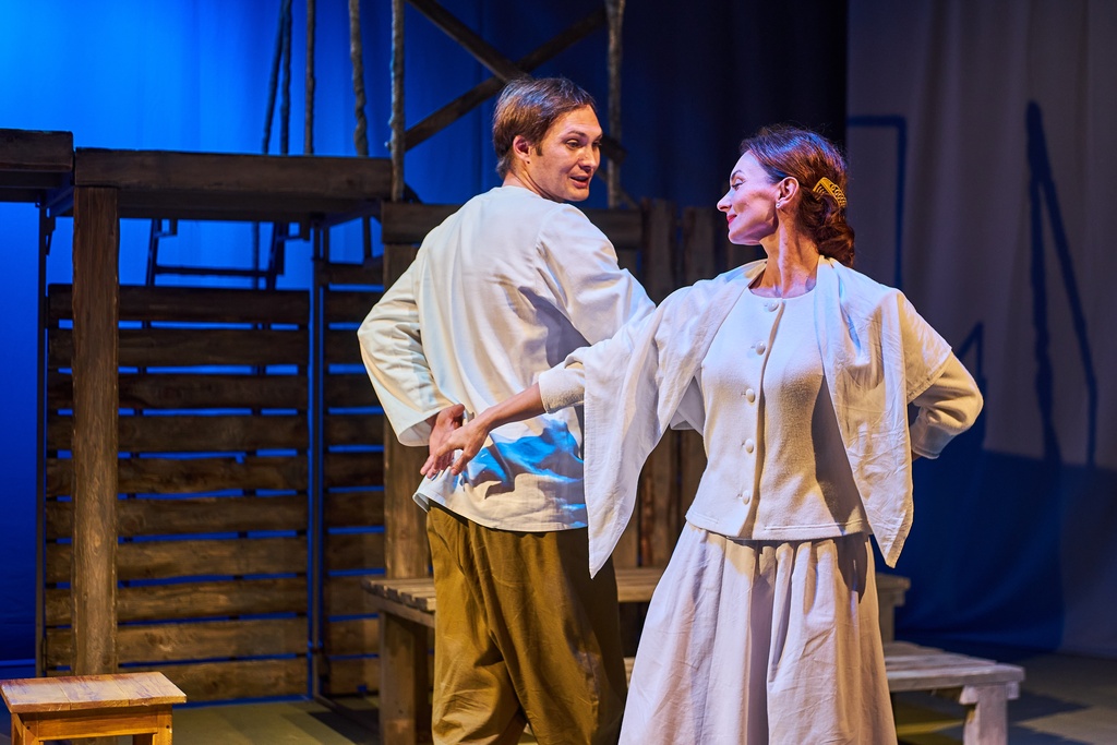 Спектакль «Синяя-синяя речка» посвящён 75-летию победы в Великой Отечественной войне. Но зритель не увидит на сцене театра сражений, не испытает высокое чувство пафоса, да и сама война здесь проходит фоном, где-то далеко. На первый план в новом спектакле Молодёжного театра выступают темы любви и непобедимости жизни. Спектакль, поставленный художественным руководителем театра Мусалимом Кульбаевым по мотивам повести Бориса Вахтина «Одна абсолютно счастливая деревня», повествует о молодой женщине, ставшей вдовой в самом начале войны. Солдат возносится на небо и оттуда ведет мистический диалог со своей женой…