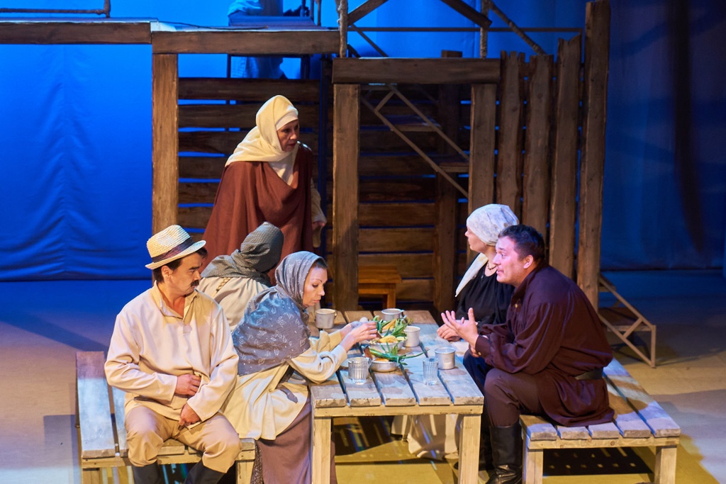 Спектакль «Синяя-синяя речка» посвящён 75-летию победы в Великой Отечественной войне. Но зритель не увидит на сцене театра сражений, не испытает высокое чувство пафоса, да и сама война здесь проходит фоном, где-то далеко. На первый план в новом спектакле Молодёжного театра выступают темы любви и непобедимости жизни. Спектакль, поставленный художественным руководителем театра Мусалимом Кульбаевым по мотивам повести Бориса Вахтина «Одна абсолютно счастливая деревня», повествует о молодой женщине, ставшей вдовой в самом начале войны. Солдат возносится на небо и оттуда ведет мистический диалог со своей женой…